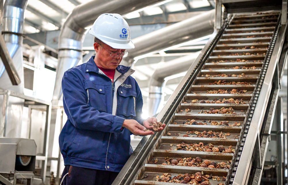 2024年12月11日,凉山亿丰油脂有限公司的员工在核桃脱壳生产线旁工作。新华社记者 张超群 摄
