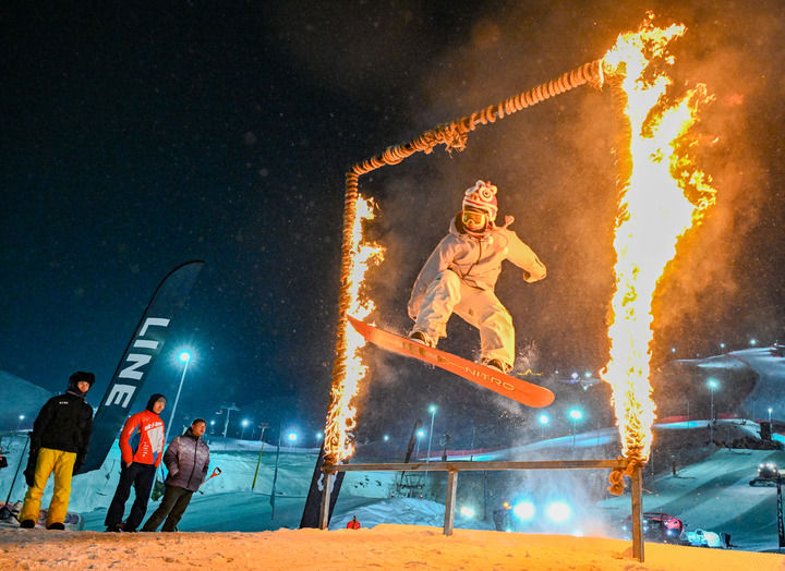 在坐落于阿勒泰市城区的新疆将军山国际滑雪度假区,雪友在新春趣味滑雪公园跳台活动中钻过火圈(2025年1月29日摄。新华社记者 陈朔 摄