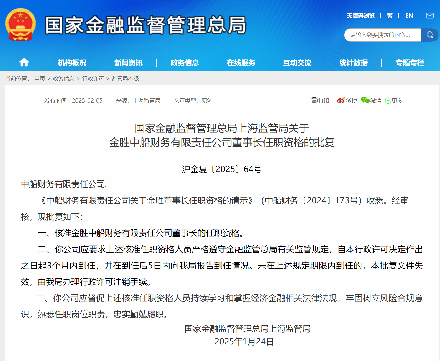 金胜获批担任中船财务公司董事长巴适游戏网• 2025-02-05 18:03:12•快讯•阅读 1630 财经2月5日讯 今日,国家金融监督管理总局上海监管局公布相关批复,核准金胜中船财务有限责任公司(简称:中船财务公司董事长的任职资格。以下是相关批复正文: 申杨 标签: 金融/ 奈雪的茶多店春节业绩大涨630% 瘦瘦小绿瓶最受欢迎 上一篇2025-02-05CK母公司被列入不可靠实体清单,去年9月底以来股价已跌近15%下一篇 2025-02-05相关推荐 “内部人员”可办“靓号”?起底代办车牌套路购置新车,谁都希望能有一组心仪的车牌号,而除了正常选号,也有人试图托这样那样的“内部关系”,办到一张所谓的“靓号车牌”>>>2025-02-05 18:03:12583 2025善议论坛:江南布衣携手 Spiber 以未来纤维重启时尚新纪元随着越来越多品牌、科技企业与平台加入这一进程,下一代材料供应链的重塑必将加速推动时尚产业迈向一个更加绿色与可持续的新纪元。2025-02-05 18:03:12359 青小云带您解码青云店:一座现代小镇的生机美视频无法播放,请升级浏览器至最新版。2025-02-05 18:03:121777 司法部发布规范涉企行政执法专项行动第二批典型案例贵州某县政府行政执法监督局针对县交警大队辅警独立执法的问题,明确执法辅助人员与正式执法人员的权责边界,杜绝辅助人员独立执法。 针对涉企检查“频次过高、重复2025-02-05 18:03:12826 新版室外健身器材安全国家标准近日实施 一图看懂十二个变化新版《室外健身器材的安全通用要求》新增总体要求、绿色环保和可回收材料要求、载荷计算方法等内容,并增加了适老化和适儿化要求,突出对“一老一小”的关爱。2025-02-05 18:03:121932 逆势向上!中国外贸增速逐季加快着眼细分数据,外贸“稳中向好”的“面貌”更加清晰,抗压抗逆能力进一步显现。 从季度看,增速逐季加快。从一、二季度分别增长1.3%、4.5%,到三季度增长6%,我国进出口已2025-02-05 18:03:12104 我国首份城市综合发展指数报告发布 北京、深圳、上海综合排名前三综合评估结果显示:我国城市高质量可持续发展呈现“头部引领、整体向好”的良好态势。北京、深圳、上海位居综合排名前三。 综合评估结果显示:我国城市高质量可持续2025-02-05 18:03:12918 李正斌获批担任中铁信托总经理中国网财经10月13日讯 今日,四川金融监管局公布相关批复,核准李正斌中铁信托有限责任公司总经理的任职资格。以下是相关批复正文: 公开资料显示,中铁信托是经国家金融2025-02-05 18:03:12718