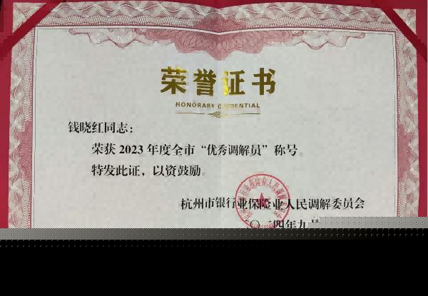 浙江分公司兼职调解员钱晓红获评年度“优秀调解员”称号