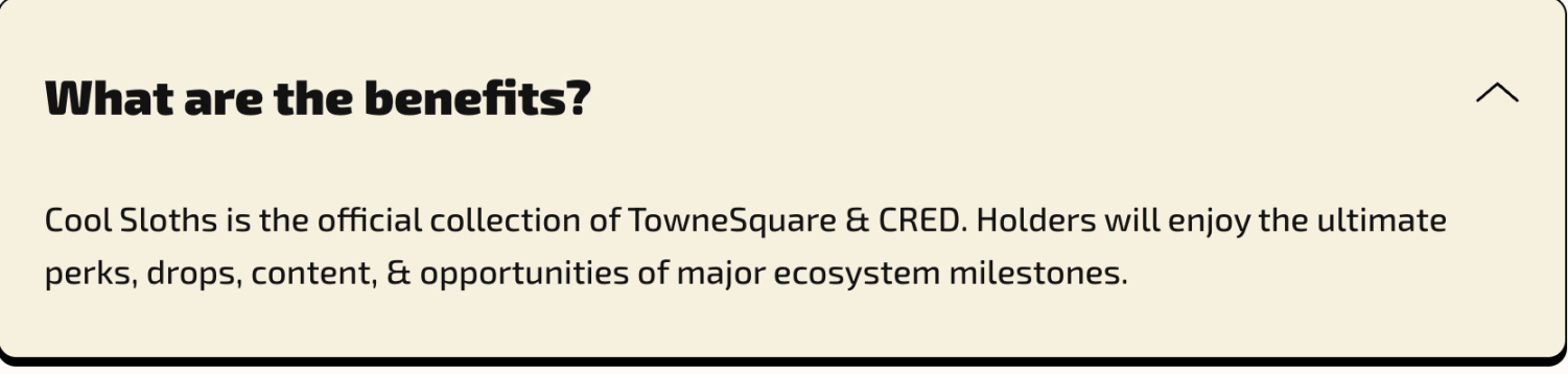 除此之外,项目方明确表示「Cool Sloths 是 TowneSquare 和 CRED 的官方 NFT 系列。持有者将享受主要生态系统里程碑的福利、Drop、内容和机会。」