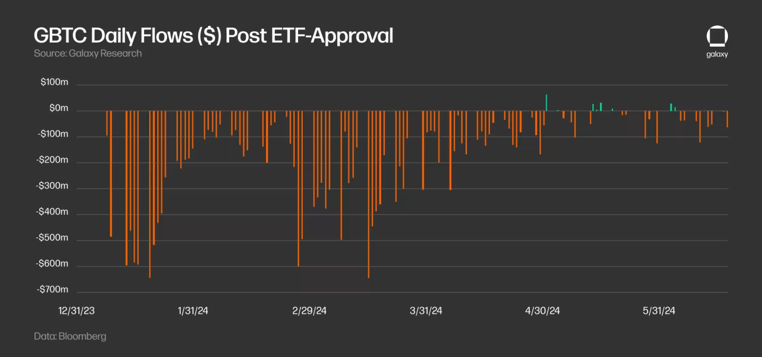 - GBTC 交易的解除对整体 ETF 流入造成了影响。自将信托转换为 ETF 以来,GBTC 在前几个月经历了显著的流出。GBTC 的每日流出在 3 月中旬达到峰值,3 月 18 日的流出额为 6.42 亿美元。自那以后,流出有所缓和,GBTC 自 5 月起甚至出现了几天的净流入(在 5 月 3 日首次出现净流入之前有 78 天的流出)。截至 6 月 15 日,自 ETF 启动以来,GBTC 持有的 BTC 余额从 61.9 万 BTC 减少到 27.8 万 BTC(减少了 55%)。