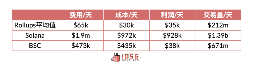 可以看出,Rollups 整体的利润率和Solana较为接近,相较BSC有明显优势,体现出 Rollups 的商业模式在盈利能力和成本管理方面的优秀表现。