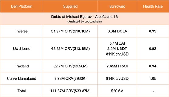 Lookonchain统计指出,Michael Egorov在Inverse、UwU Lend、Fraxlend和Curve LlamaLend平台上的健康因子均低于1,跌破清算线的CRV多达1.11亿枚(约3,387万美元)。