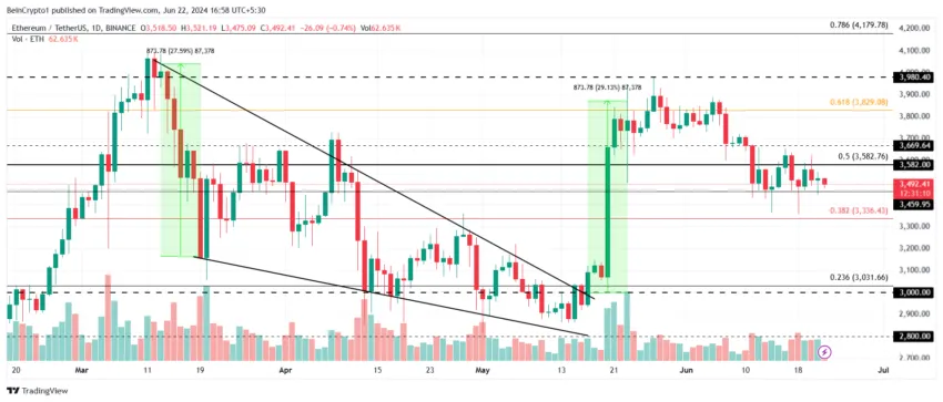然而,如果突破尝试失败,以太坊可能会继续在当前价格区间内横盘整理。若大盘的看跌情绪加剧,导致价格跌破3,459美元的支撑位,那么看涨的预期将受到挑战。在这种情况下,以太坊的价格可能会进一步下跌至38.2%斐波那契线,即3,336美元。