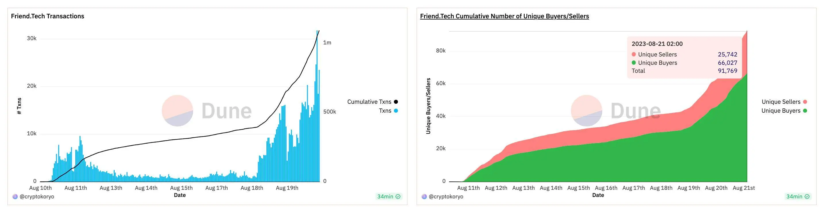 去年8月中旬friend.tech开始冒头,份额(Key) 买卖总交易量超过100万,独立买家超6.6万,独立卖家2.5万,可谓是 StepN 之后又一个几乎全民参与的加密产品。