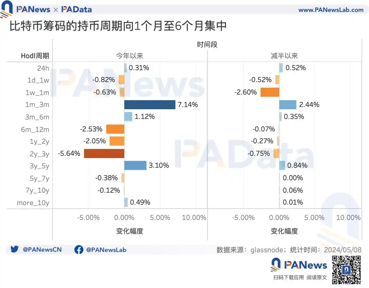 流通速率的快速下降可能意味着更多筹码处于积累过程中。从时间周期来看,今年以来,持币周期在 1 个月至 3 个月、 3 个月至 6 个月、 3 年至 5 年的筹码数量有明显的增长。尤其是持币 1 个月至 3 个月的筹码占比,今年增长了 7.14 个百分点,减半后增长了 2.44 个百分点,这表明持币周期从短期向中长期积累的趋势。