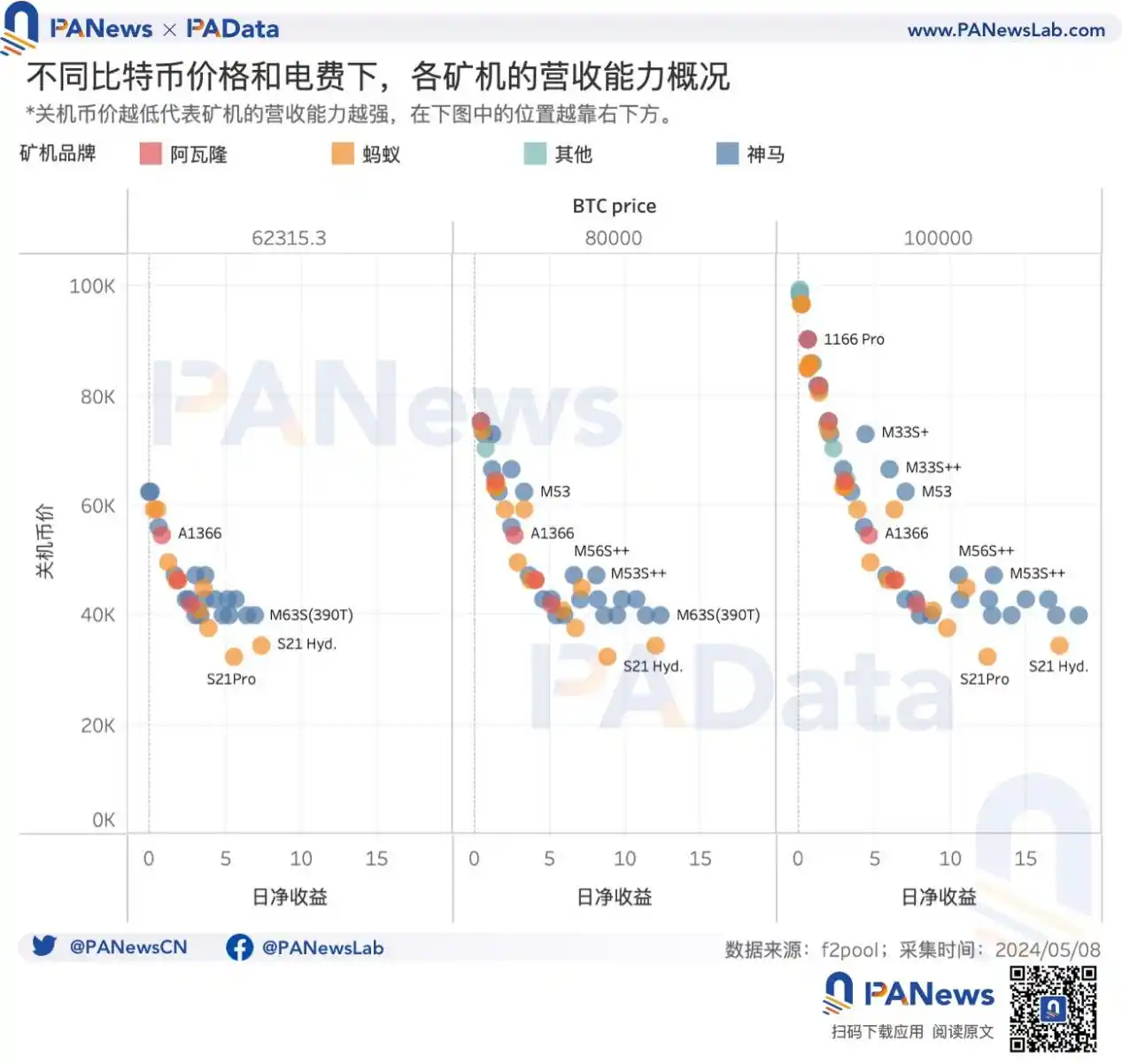假设电费仍然保持低位,当币价上升至 80000 美元时,能够盈利的矿机数量将达到 45 种,关机价最低的仍然是蚂蚁 S 21 Pro ,日净收益最高的是神马 M 63 S ( 390 T ),达到 12.30 美元。当币价上升至 100000 万美元时,能够盈利的矿机数量将达到 66 种,关机价最低的是蚂蚁 S 21 Pro ,日净收益最高的是神马 M 63 S ( 390 T ),达到 18.41 美元。当币价上涨时,对矿工而言,可选择的矿机种类大幅增加,且可以多元配置。