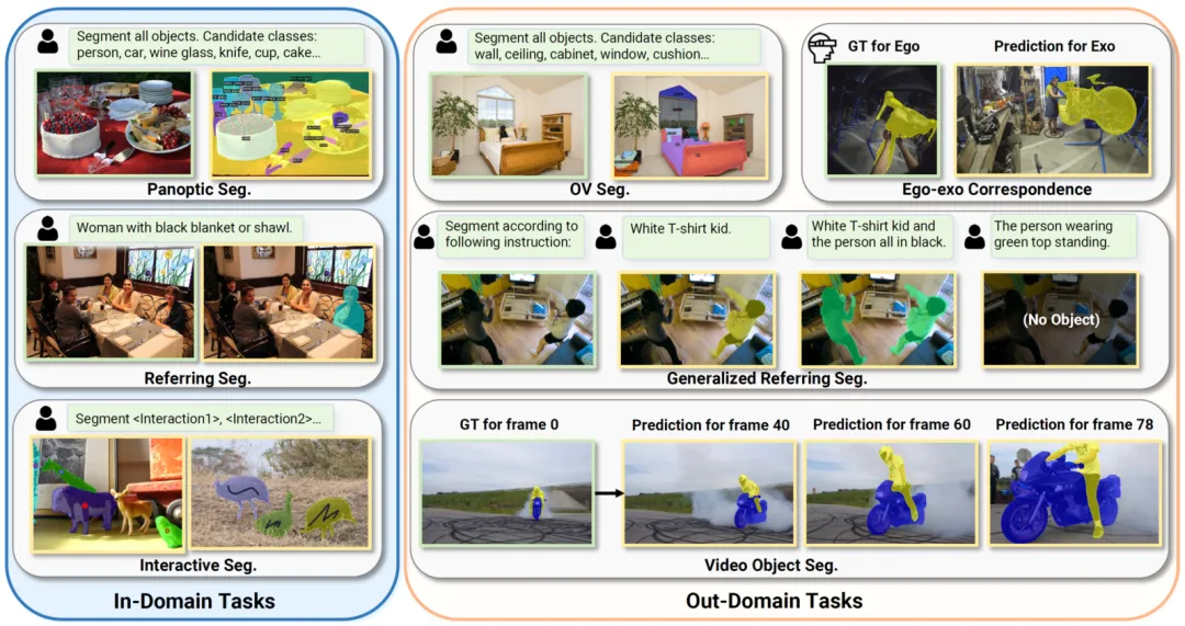 下图展示了 PSALM 在多个任务上的可视化结果包括全景分割、指令分割、交互式分割、开放词表实例分割、通用指令分割、视频目标检测和 Ego-Exo 多视角匹配分割。