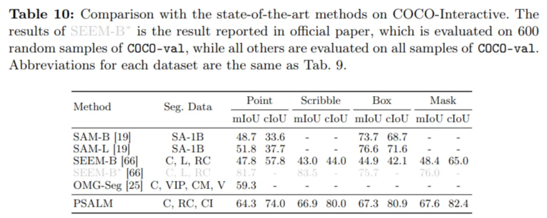 对于交互式分割任务,由于当前没有开源的交互式分割数据集和测试基准。因此,在 COCO 的基础上,对其中的所有目标随机生成了各种交互提示,最终生成了 COCO-Interactive 数据集。具体结果如下表所示,PSALM 在使用点,曲线,掩码作为提示下,取得了 SOTA 的效果。在使用框作为提示下,略弱于使用数据集 SA-1B 训练的 SAM。