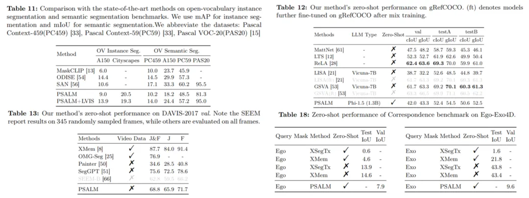 - 性能优异:PSALM 不仅在全景分割、交互式分割、指代分割等多个已见分割任务上展现出比肩或超越专家模型的强大性能,还在开放词表、视频目标分割等未见开放场景任务中表现出令人瞩目的零样本泛化能力。
