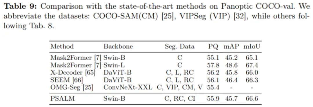 在语义分割、实例分割、全景分割等任务上,PSALM 在 COCO-val 上比较了现有的 SOTA 模型。对于采用类似规模的图像编码器的方法,PSALM 取得了极具竞争力的结果,甚至不弱于该任务上的专家模型。