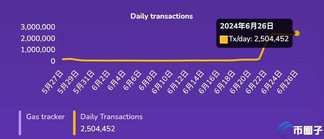 2. 根据 Saakuru Blockchain Explorer 数据显示,从 6 月 23 日开始,Saakuru 的交易数暴涨超过 1,000%,一直到 6 月 26 日单日提升至 250 万笔交易,大大超越目前主导游戏链的 Ronin。