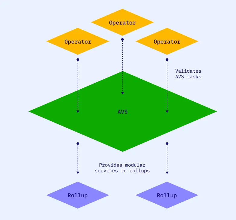 主动验证服务(AVS)是指任何需要自有分布式验证语义进行验证的系统,例如侧链、数据可用性层、虚拟机、Web3 Keeper 网络、桥接器、阈值加密方案、可信执行环境等。每个主动验证服务(AVS)都有一套智能合约。