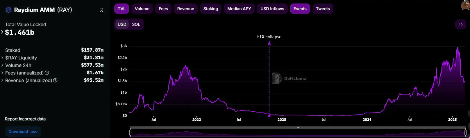 Raydium作为Solana生态的重要AMM平台,其总锁仓量长期领先。Pump.fun自建AMM池,标志着其不再满足于仅仅作为Raydium的流量提供者,而是试图成为流动性的掌控者,直接掌控交易费用分配。