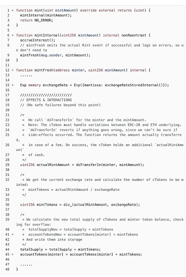 从「 exchangeRateStoredInternal 」函数可以看出,由于此时 _totalSupply 是 2 不是 0,因此需要计算 exchangeRate 的值,通过公式「 exchangeRate = (totalCash totalBorrows - totalReserves) / totalSupply 」计算出,目前的 exchangeRate 为「 17,735,851,964,756,377,265,143,988,000,000,000,000,000,000 」,这个值远远大于设置的初始 exchangeRate 「 200,000,000,000,000,000,000,000,00 」。