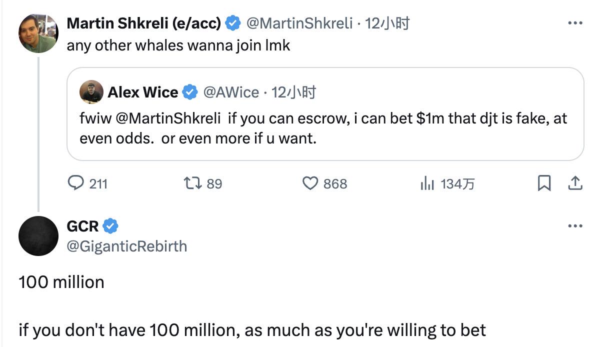 另外,巨额赌约也为DJT增加了更多看点。图灵制药公司前总裁Martin Shkreli在暗示DJT为特朗普官方代币并为该代币“喊单”的同时,与多位加密KOL立下数百万甚至上亿美元的赌约,如GCR与Martin Shkreli就“DJT是否为特朗普推出”立下1亿美元的赌约。谁能料到,这位制药巨头的高管就是真正操纵者。