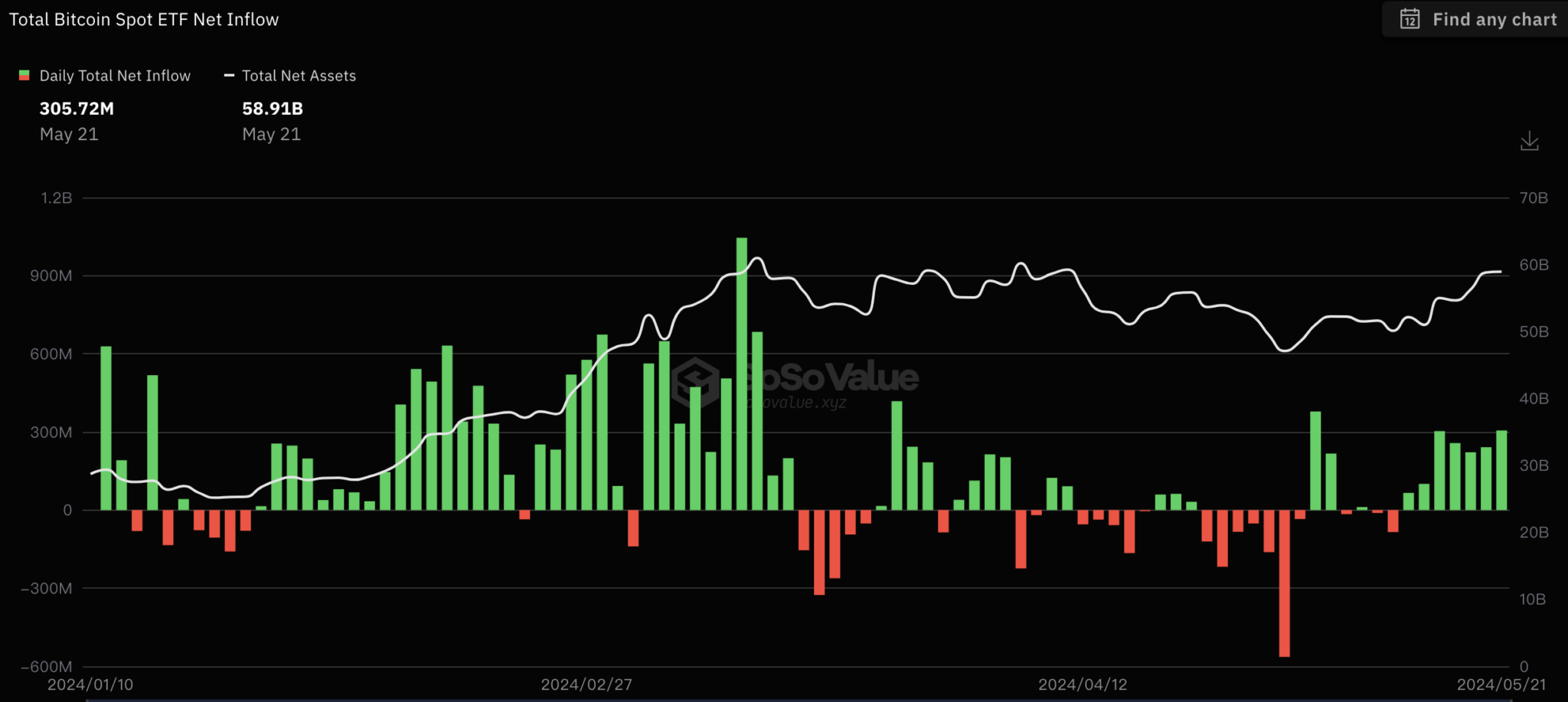 SoSoValue数据显示,比特币现货ETF21日净流入总额为3.06亿美元,已连续7天净流入。灰度GBTC资金净流出为0,贝莱德ETFIBIT单日净流入2.9亿美元,比特币现货ETF总资产规模达到589.1亿美元。