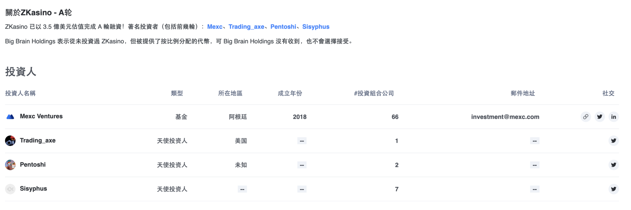 ZKasino A轮融资,其中BigBrain Holdings表示并未投资ZKasino而被排除在投资人名单之外