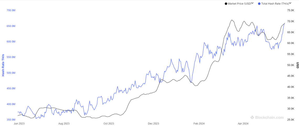 链上数据表明,比特币挖矿的算力在经历了减半事件后的短暂下跌后,已经显著回升,并且达到了一个新的历史最高点(ATH)。