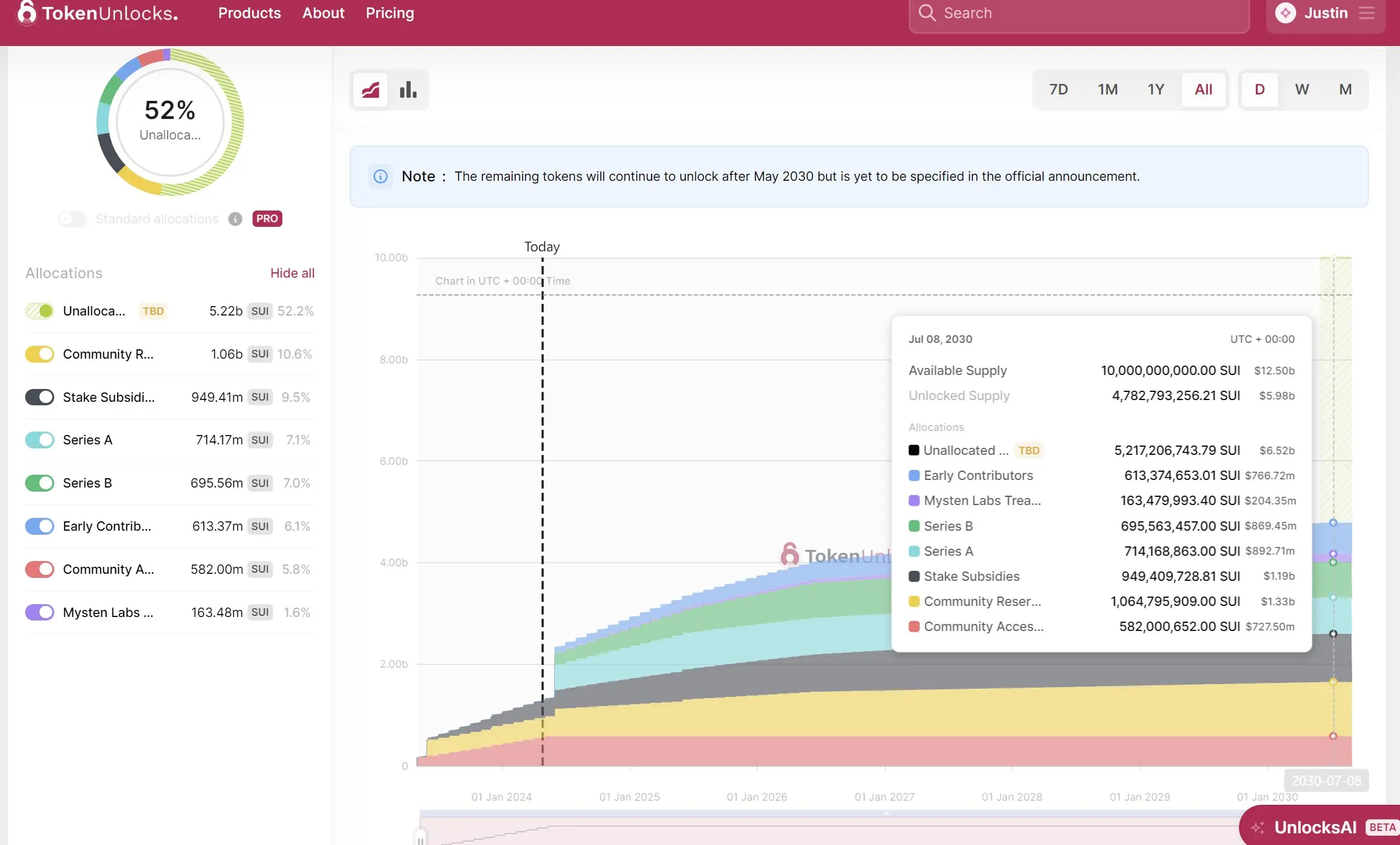 Sui 的设计很棒,除了其代币经济学: SUI 声称拥有 100 亿枚的总供应上限,其中 52% 在 2030 年之前将「未分配」( unallocated )。