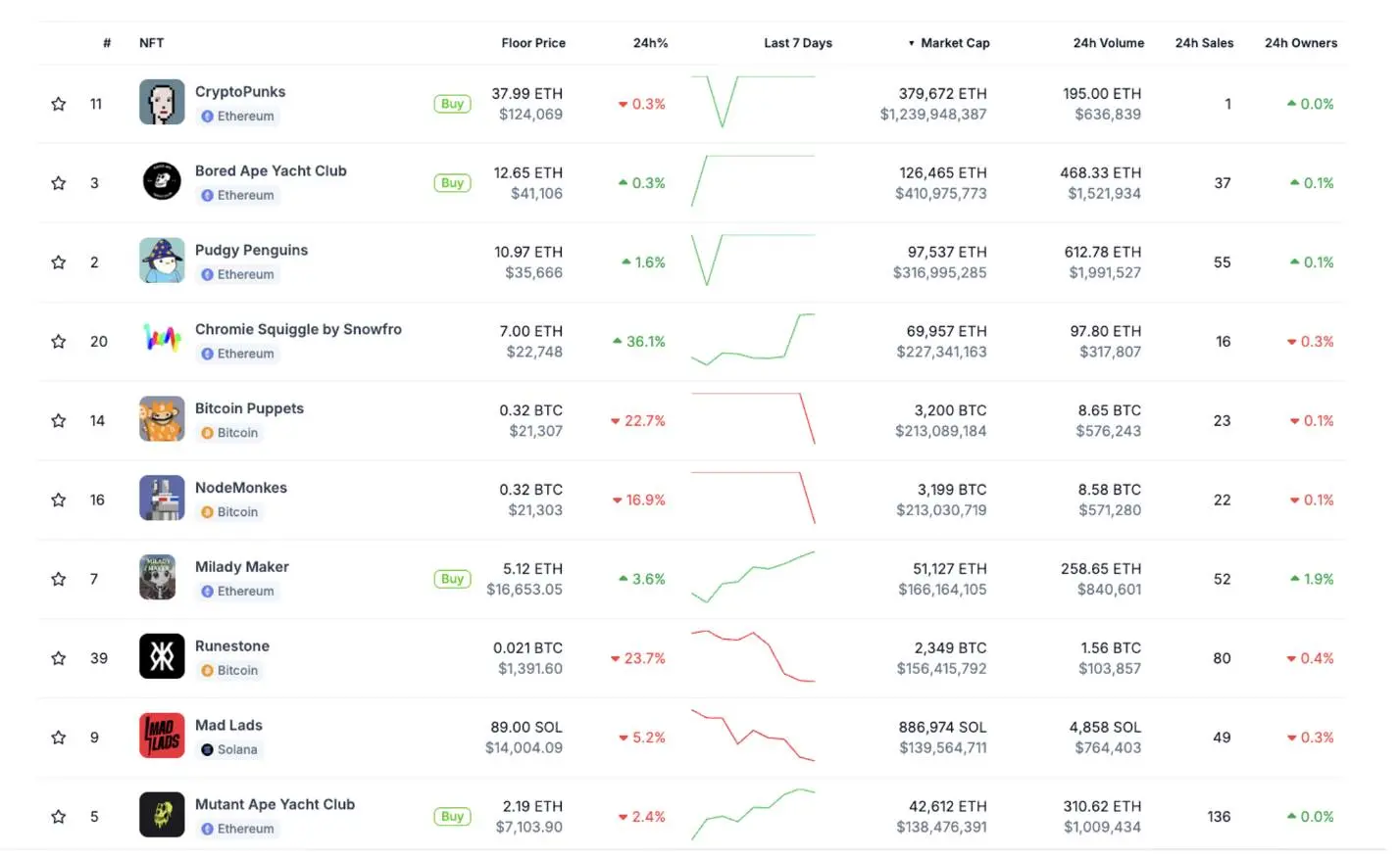 如今,在 Odinals 出现一年多之后,比特币网络上发行的 NFT 项目中有三个进入了所有 NFT 市值的排名前 10 名 (NodeMonkes、Runestone 和 Bitcoin Puppets),表明了作为一个可行的智能合约平台的潜力。