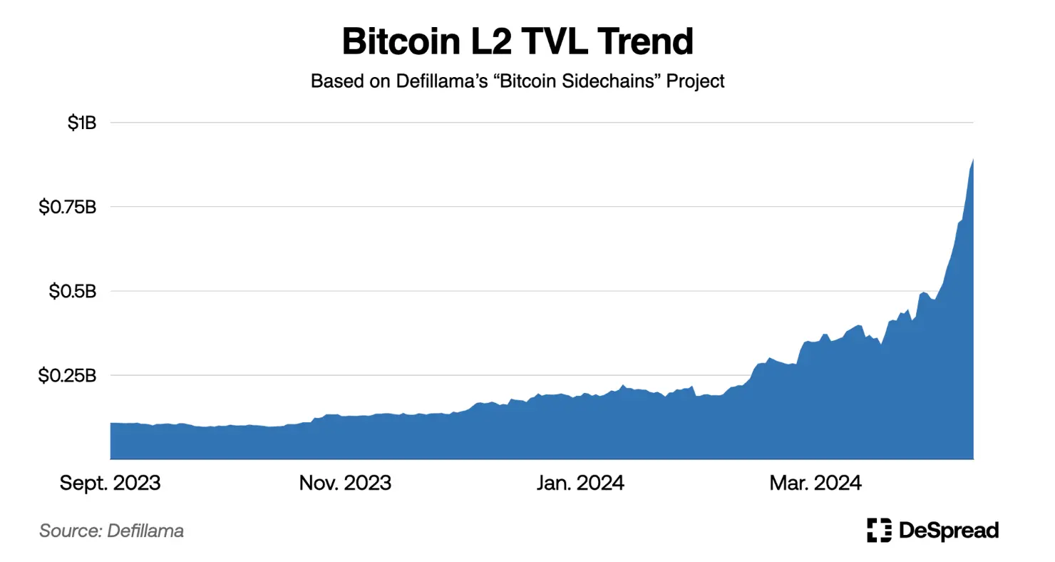 这也导致了比特币网络上 L2 项目的激增。根据 defillama 的数据,在撰写本文时 (4 月 15 日),有 11 个项目被归类为 "比特币侧链",总 TVL 接近 9 亿美元。虽然对于这些项目是否实际以比特币网络为 L1 等的 争议存在,但正在快速成长的 TVL 和项目数反映出市场对比特币叙事的兴趣越来越大。