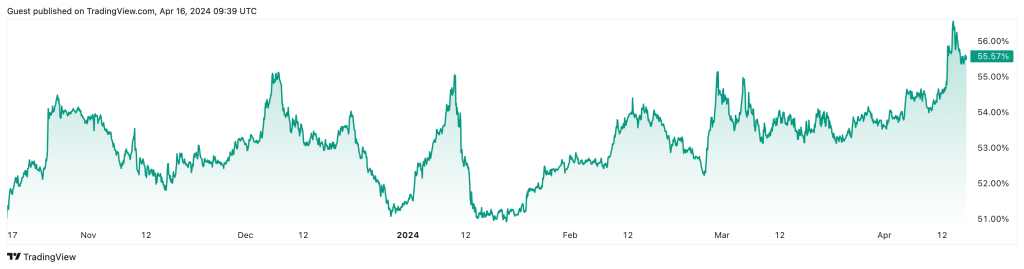 本站(120bTC.coM):数字资产管理平台Matrixport表示:「有些人认为我们应该处于山寨币(竞争币,Altcoins)反弹的风口浪尖。尽管少数Meme币和山寨币出现了大规模反弹,但根据比特币的市值占比,更广泛的上涨空间可能仍处于起步阶段,这表明本轮牛市非常狭窄(Narrow Bull Market),因比特币获得了更多的市场份额。」