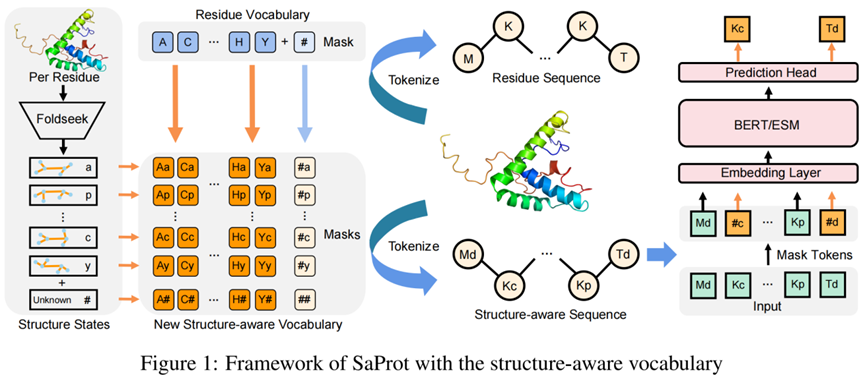 本文利用Foldseek将蛋白质进行编码,生成了一维的3Di结构序列(使用了Foldseek的结构词表,每种3Di token代表不同的局部结构),这样的结构序列与氨基酸序列是等长的。