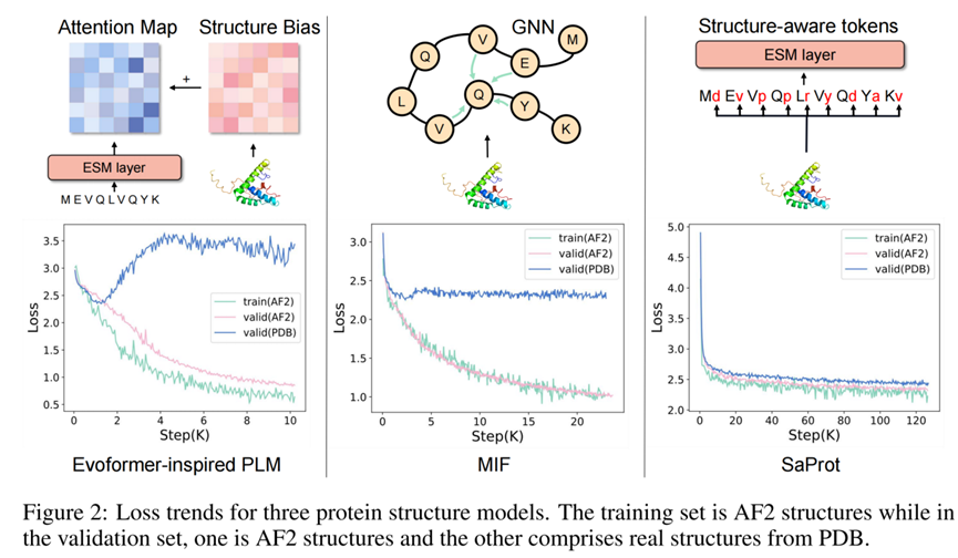 然而从loss图中可以发现,当上述两种建模方式在AF2结构上使用MLM的训练目标进行预训练时,模型会非常迅速地过拟合(表现为在AF2预测结构上预测loss非常低,但在PDB真实结构上loss停滞甚至上升)。