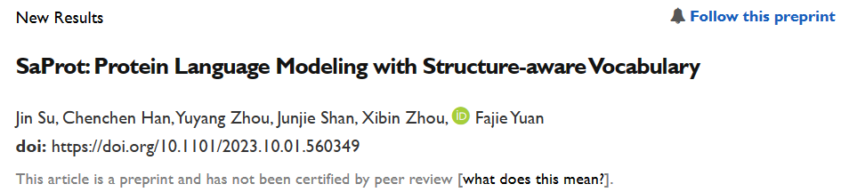 研究《SaProt: Protein Language Modeling with Structure-aware Vocabulary》的预印版本,于 2024 年 3 月 21 日发布在 bioRxiv 预印平台。