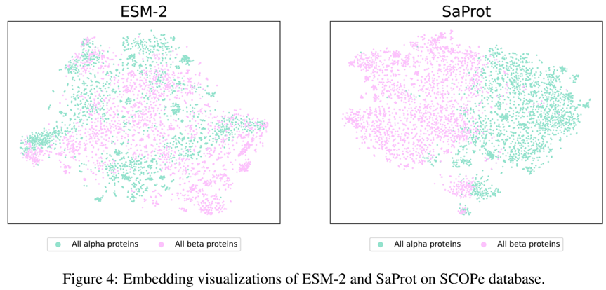 从结果可以看到,由于结构token的嵌入,SaProt的表现大大超越了ESM-2,这表明SaProt蕴含了非常丰富的结构信息,使其能够在结构预测任务上获得十分优异的结果。同时,论文在SCOPe数据库上对alpha蛋白质和beta蛋白质进行了可视化,结果如下: