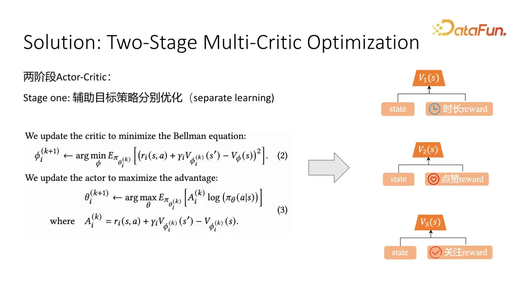 在第一个阶段辅助目标优化时,采取了典型的 actor critic 优化方式,针对例如点赞和关注等辅助目标的优化,分别优化一个 critic,用来预估当前 state 的优劣。长期价值预估准确之后,再去优化 actor 时就可以使用 value function 来引导它的学习。公式(2)是 critic 的优化,公式(3)是 actor 的优化,针对 critic 的优化,在训练时会用到当前的 state 和下一步的 state 以及当前 action 的采样。根据 Bellman equation 可以得到 action,再加上未来的 state 的 value 预估,应该趋近于当前 state 的预估,这样去优化就可以逐渐逼近准确的长期价值预估。在引导 actor 学习,也就是推荐策略学习时,会采用一个 advantage function。Advantage function 就是当采用某个 action 之后,其效果是否比平均预估更强,这个平均预估叫做 baseline。Advantage 越大,说明 action 越好,采用这个推荐策略的概率就会越大。这是第一阶段,辅助目标的优化。