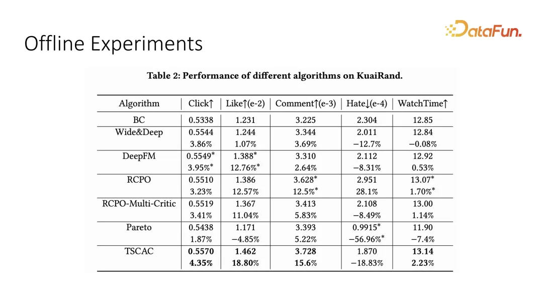 我们在 offline 的数据集上测试了多目标优化的效果,这里的主要目标是 watch time 即观看时长,辅助目标是 click、like、comment 和 hate 等互动指标。可以看到我们提出的 two-stage 的 actor-critic 能够拿到最优效果。
