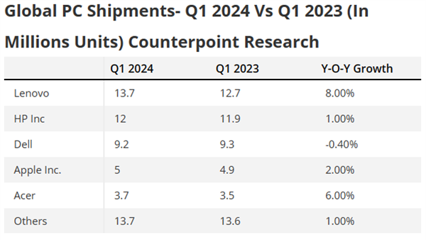 市场研究机构CounterPoint于4月23日发布了最新报告,指出2024年第一季度全球PC市场在经历了连续八个季度的萎缩后,终于迎来了复苏。报告显示,该季度全球PC出货量实现了3%的同比增长。