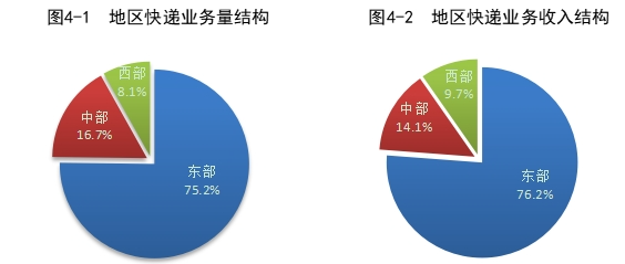 2023 年,东、中、西部地区快递业务量比重分别为 75.2%、16.7% 和 8.1%,业务收入比重分别为 76.2%、14.1% 和 9.7%。与去年同期相比,东部地区快递业务量比重下降 1.6 个百分点,快递业务收入比重下降 1.4 个百分点;中部地区快递业务量比重上升 1.0 个百分点,快递业务收入比重上升 0.7 个百分点;西部地区快递业务量比重上升 0.6 个百分点,快递业务收入比重上升 0.7 个百分点。