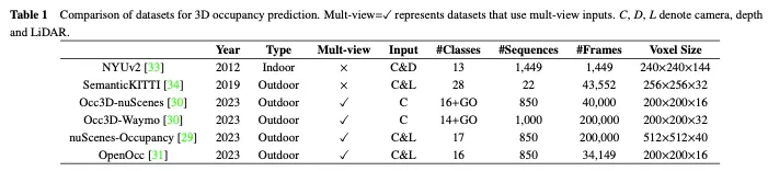 在本小节中,我们介绍了一些常用于3D占用预测的开源、大规模数据集,表1中给出了它们之间的比较。