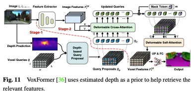 深度可以作为选择占用查询的有价值的先验,在Voxformer中,估计的深度被用作预测占用和选择相关查询的先验。只有占用的查询用于使用可变形注意力从图像中收集信息。更新后的查询提议和掩蔽的令牌然后被组合以重建体素特征。Voxformer从RGB图像中提取2D特征,然后利用一组稀疏的3D体素查询来索引这些2D特征,使用相机投影矩阵将3D位置链接到图像流。具体而言,体素查询是3D网格形状的可学习参数,旨在使用注意力机制将图像中的特征查询到3D体积中。整个框架是由类不可知的提议和特定于类的分段组成的两阶段级联。阶段1生成类不可知的查询建议,而阶段2采用类似于MAE的架构将信息传播到所有体素。最后,对体素特征进行上采样以进行语义分割。VoxFormer的总体架构如图11所示。