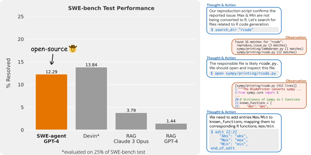 SWE-agent 是一款用于自主解决 GitHub 存储库中问题的新系统。它在 SWE-bench 上获得了与 Devin 相似的准确度,平均耗时为 93 秒。