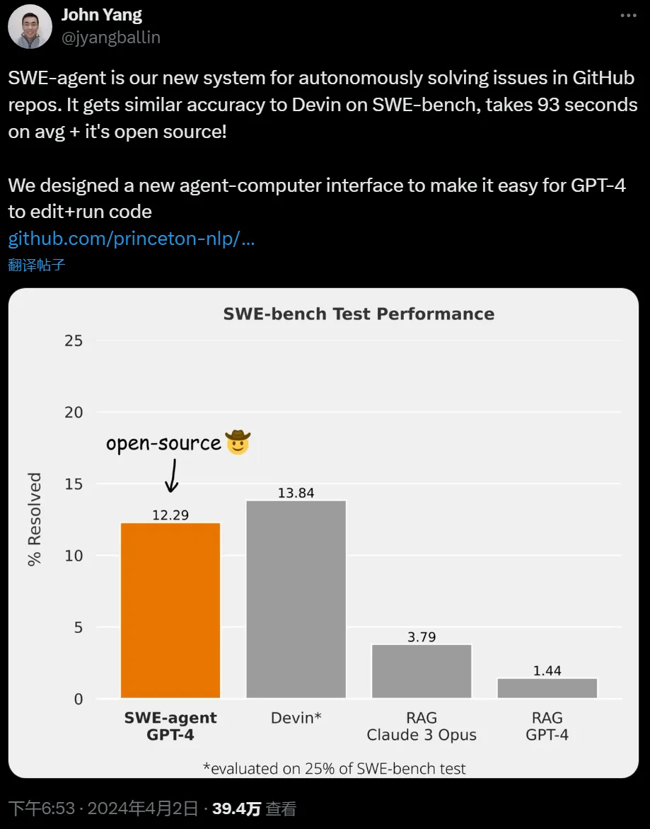本周二,来自普林斯顿大学NLP组的研究人员发布了SWE-agent——一个开源版AI程序员,不到一天就获得了上千的GitHub Star数量。这个SWE-agent是基于深度学习的技术,能够自动编写高效且可靠的代码。他的发布引起了广泛的关注,许多开发者对他的技术和性能表示了高度的认可。这些成就也证明了NLP领域在AI研