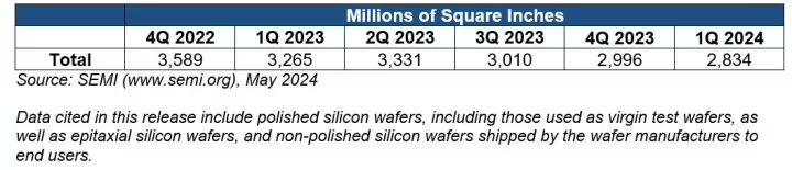 根据SEMI提供的数据显示,全球一季度半导体用硅晶圆出货量达到28.34亿平方英寸(本站注:大致相当于2500万片12英寸晶圆)。