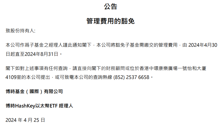值得注意的是,其中博时基金母公司博时全球交易所买卖基金开放式基金型公司还在4月25日发布文件表示,将从今年4月30日至8月31日起,豁免博时HashKey比特币ETF与博时HashKey以太坊ETF所需上缴的管理费用。