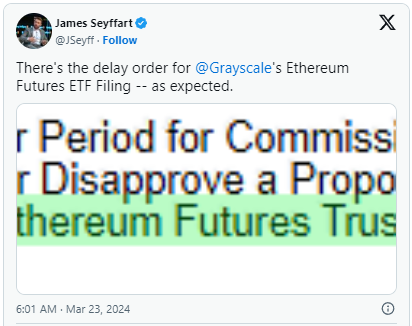 根据周五提交的文件,美国证券交易委员会宣布推迟对Grayscale以太坊期货信托的以太坊ETF申请的批准决定。新的截止日期定在5月30日。