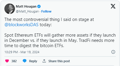 周二,Bitwise 首席信息官 Matt Hougan 在X上说:“如果现货以太坊 ETF 在12月推出而不是在5月推出,它们将吸引更多资产。因为传统金融需要更多时间来消化比特币 ETF。”