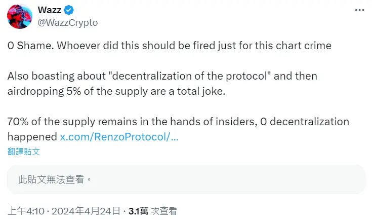 他们讽刺说,项目方一方面鼓吹去中心化,另一方面却只空投了5%的代币供应量,这显得非常荒谬。他们进一步指出,高达70%的代币供应量仍然掌握在内部人员手中,这表明所谓的去中心化根本没有实现。