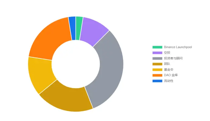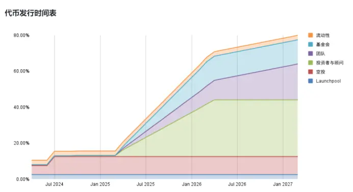 据图表显示,从代币解锁进度来看,REZ代币在初始流通阶段,其流通占比将在近一年内保持相对较低的水平,代币供应将主要由币安Launchpool以及空投份额构成,而到了明年第一季度末REZ代币的流通供应将进入加速阶段。