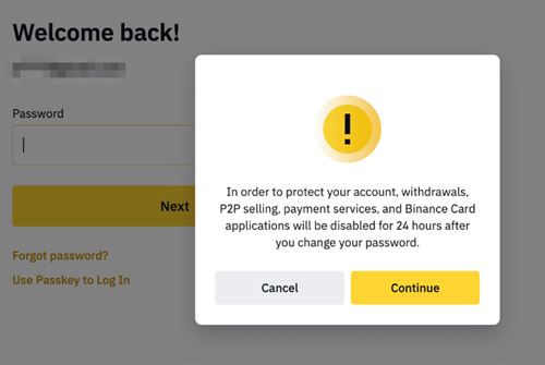 5.请仔细阅读弹出的提示信息,然后点击【继续】。请注意,为了确保账户安全,重置密码后,提现、C2C出售、支付服务和币安卡应用将会被禁用24小时。