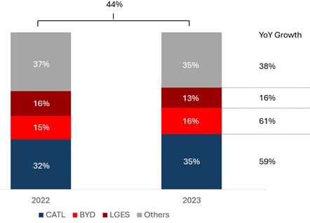 此外,中国电池制造商的增长速度超过大多数其他国家,占全球电动汽车电池产能的三分之二以上,其中宁德时代占比 35%、比亚迪占比 16%。