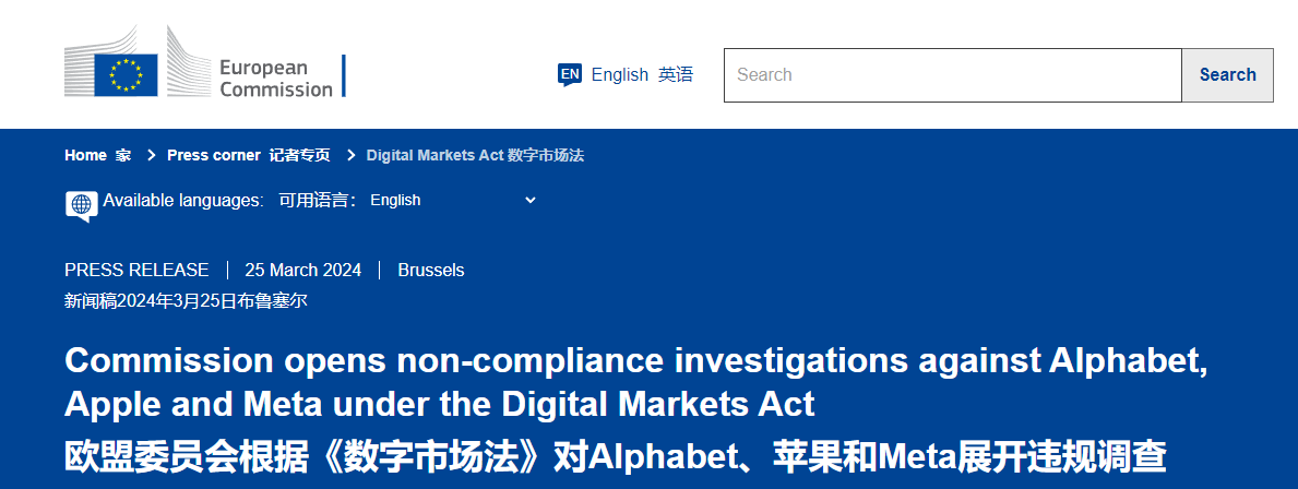 据本站 3 月 25 日报道,欧盟委员会今日宣布将展开全面调查,重点关注苹果、谷歌和 Meta 这三家科技巨头对欧盟《数字市场法案》的遵守情况。