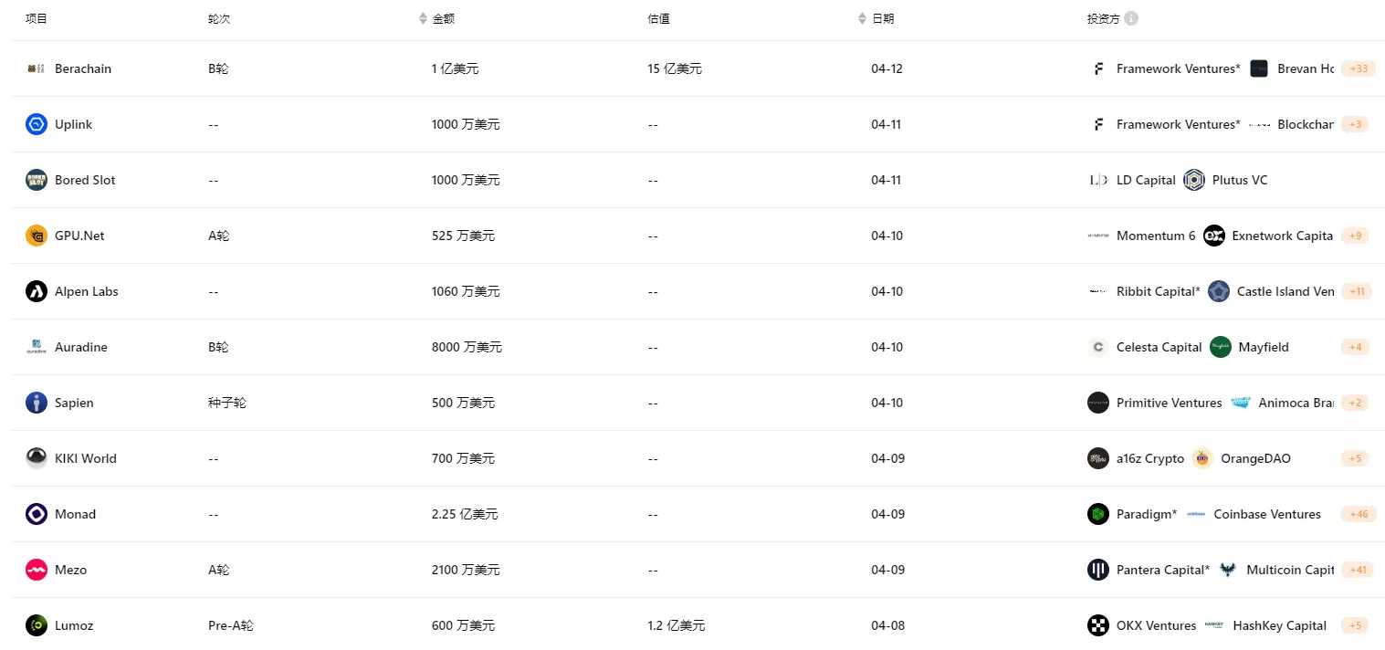 从赛道分布来看,获得融资的项目主要分布在基础设施和 DeFi 赛道。最热门的标签是 Layer1 公链,其中 EVM 并行化区块链 Monad 完成由 Paradigm 领投 2.25 亿美元,这是2024 年迄今为止最大的加密货币领域融资。基于 DeFi 的 EVM 兼容链 Berachain 完成 1 亿美元 B 轮融资,Framework Ventures 等领投。其他热门项目还有 ZK-RaaS 网络 Lumoz、比特币 Layer2 网络 Mezo、BTC 再质押基础设施 BounceBit等等。